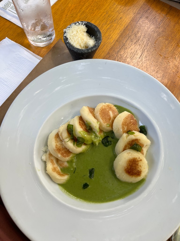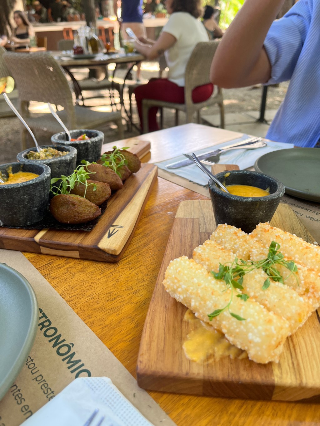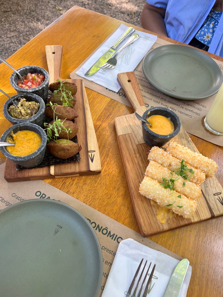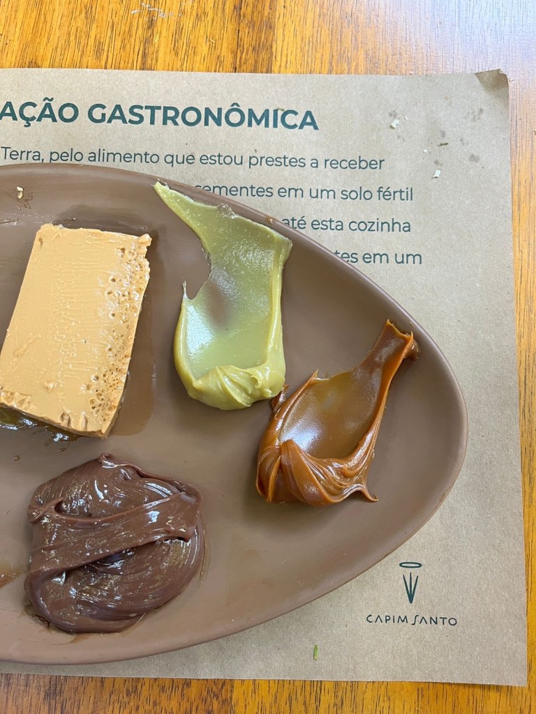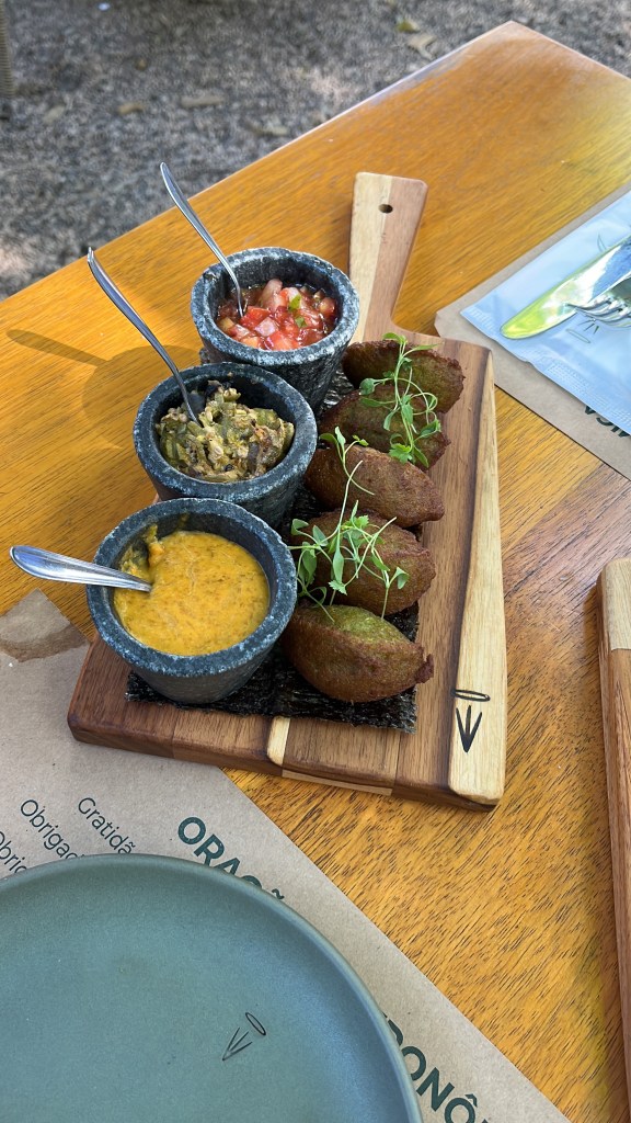 Churros de tapioca com vatapá, mini acarajé de capim santo, ravioli de tapioca com queijo e molho de ervas e, de sobremesa, vários docinhos a vontade (por R$ 44). Eu pedi o brownie e brigadeiro de capim santo, bolo de coco e a cocada cremosa.