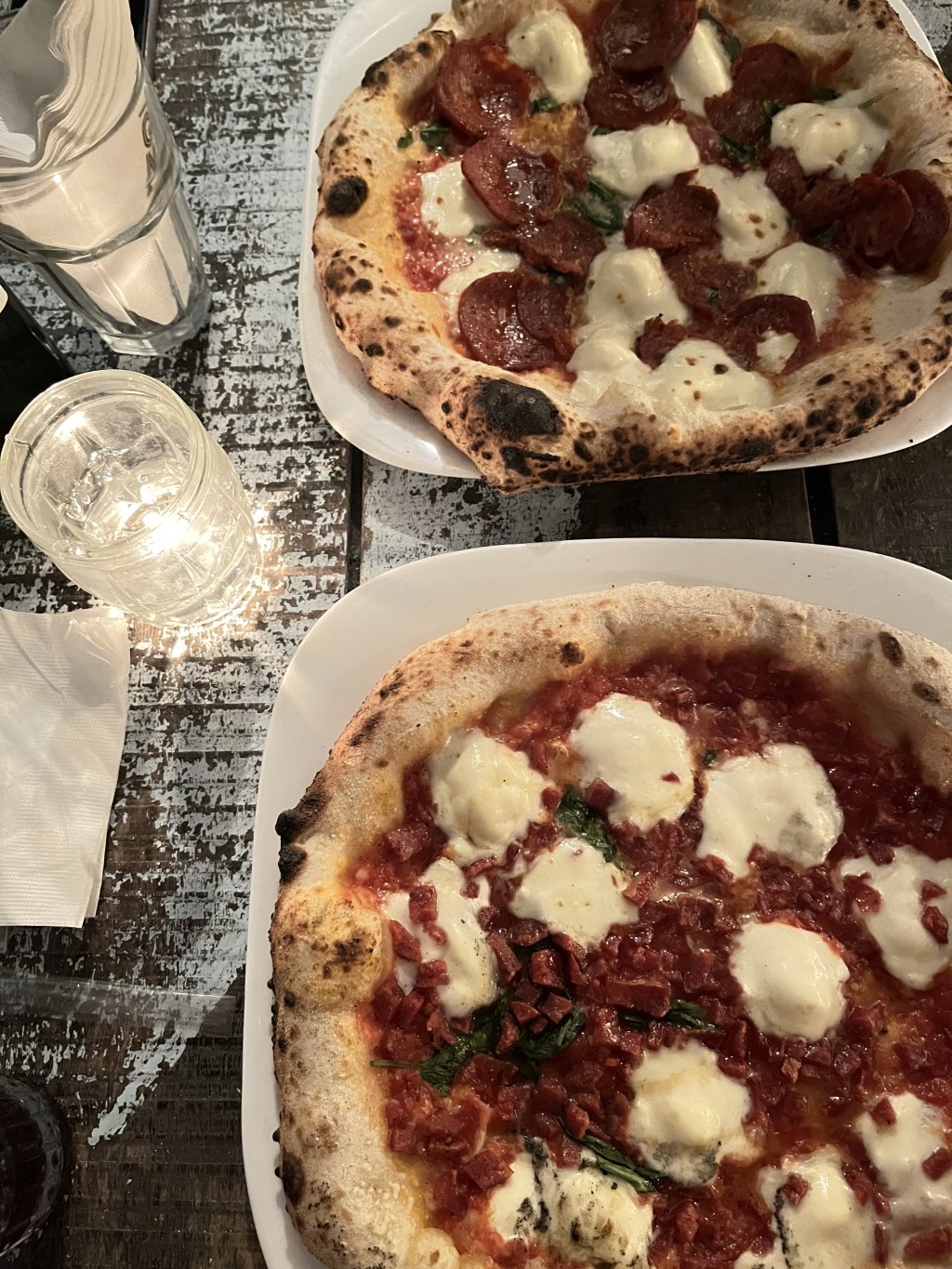Arancini genovese (bolinho de risoto de parmesão), pizza diavoletti (salame picante com mel), pepperoni, mousse de chocolate e brigadeiro de pistache.