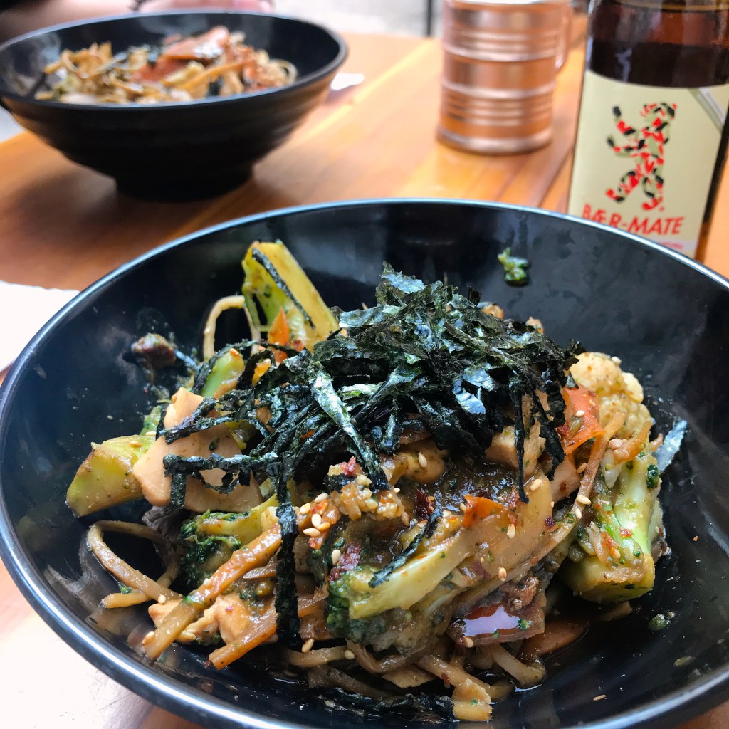 Yakisoba mista de pupunha, arroz com Kimchi (famoso mexidão coreano) e baer Mate.
