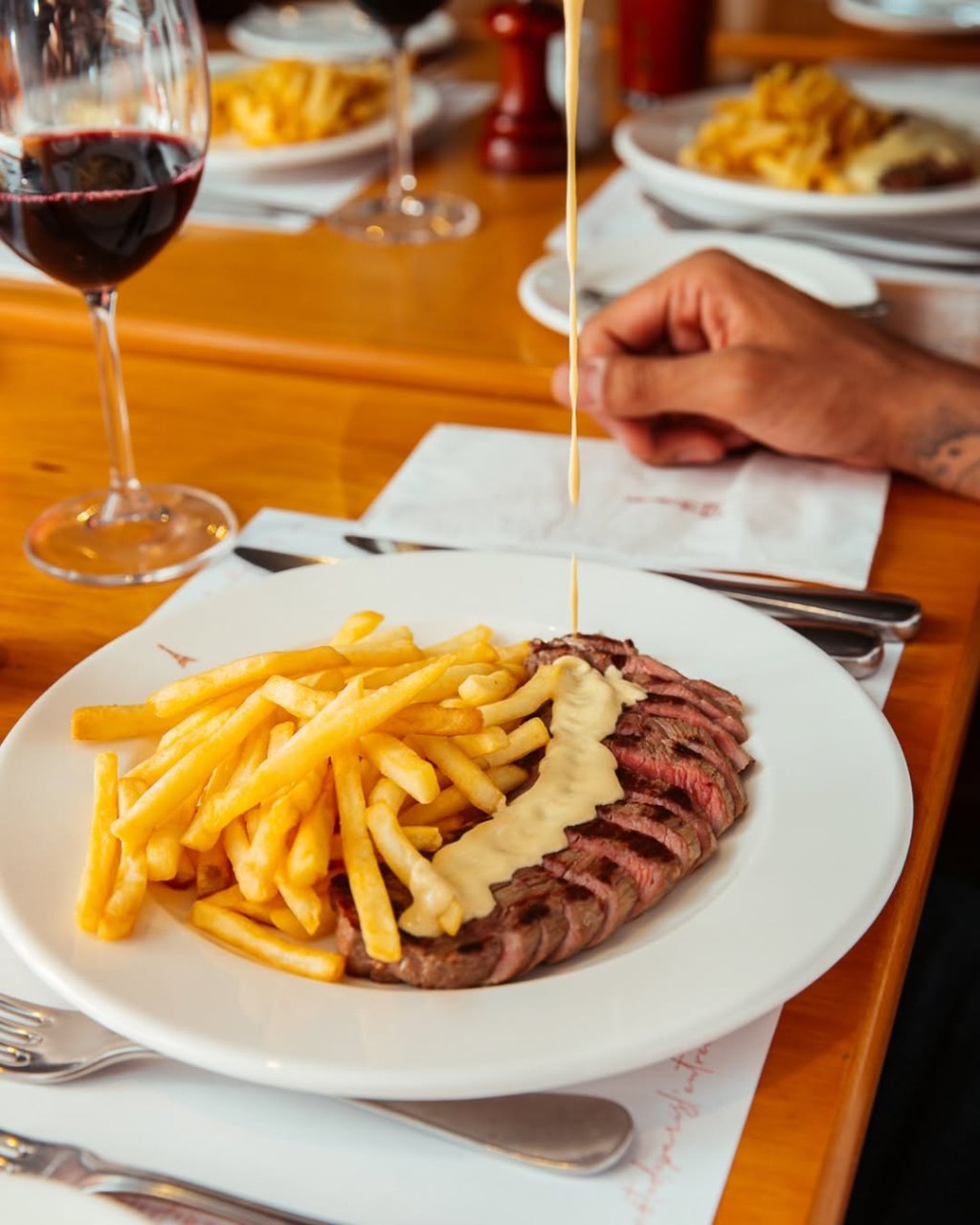 O cardápio traz o icônico Entrecôte com molho secreto, acompanhado por batatas fritas crocantes, além de uma seleção de entradas, como steak tartare, queijo brie, saladas e burrata de búfala. Os amantes de sobremesas também poderão degustar clássicos franceses, como o crème caramel (pudim) e o mille feuilles Eiffel (mil-folhas).