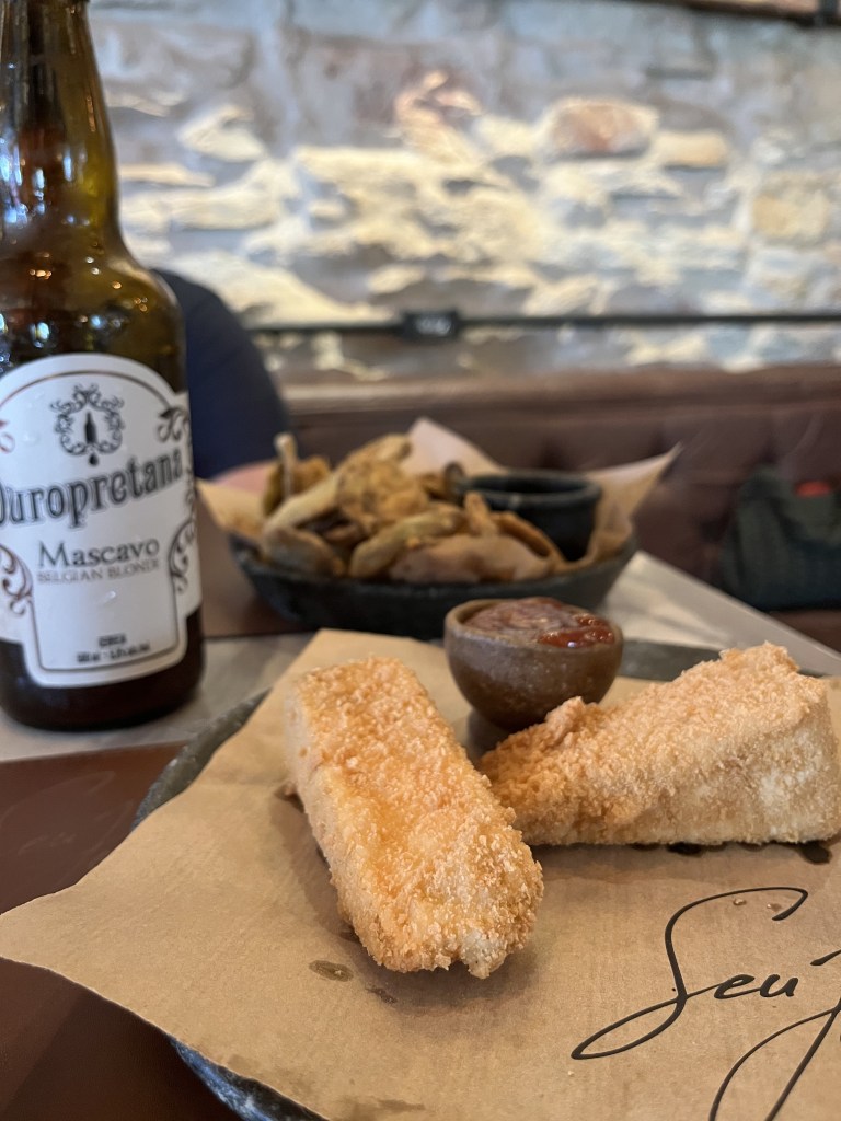 A primeira parada foi no restaurante Seu José, do ladinho da Casa dos Contos, há poucos minutos do centro da cidade. O restaurante é famoso por oferecer pratos típicos da culinária mineira, como feijão tropeiro, frango com quiabo e carne de sol. E já que lá encontramos algumas iguarias, começamos pedindo de entrada a opção “Chico Rei”, um tempurá de jiló acompanhado de teriyaki de rapadura (R$36) e o “Casadinho”, queijo Brie empanado acompanho de calda de goiabada picante (R$54).