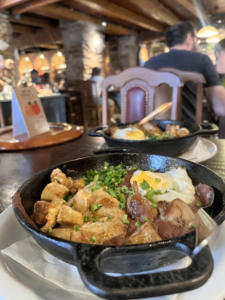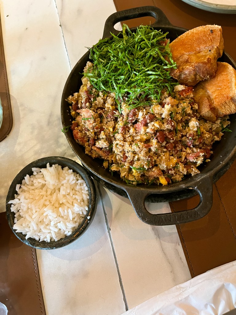 De principal, pedimos pra dividir a opção “De Minas” pra uma pessoa, o tradicional Feijão Tropeiro feito com feijão vermelho, calabresa, bacon, ovos e farinha de mandioca, acompanhado de torresmo de barriga assado e couve fininha (R$69). É um prato muito bem servido, que deu tranquilamente pra dividir pra duas pessoas, mas, se você preferir, há também a opção maior desse mesmo prato. E pra acompanhar, pedimos a cerveja Ouropretana Mascavo, produzida localmente; essa é uma cerveja mais docinha que combina super bem com os pratos típicos da região.