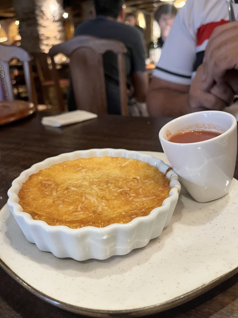 Depois da mina, fomos almoçar no restaurante Contos de Réis, localizado dentro de um casarão do século XVIII e com uma vista incrível da cidade. Nossos pedidos foram um Feijão Tropeiro (R$69) e um Tutu à mineira (R$68). Ambos vinham acompanhados de arroz, torresmo, linguiça, ovo, couve e lombo. São pratos tradicionais e típicos muito bem feitos. Não achamos tão bem servidos quanto o restaurante Seu José, mas a comida é tão gostosa que vale a pena conhecer – pra te deixar mais satisfeito, talvez seja legal pedir uma entradinha antes. De sobremesa, escolhemos a opção “Mineirinha”, uma cocada cremosa com calda quente de goiabada artesanal (R$39).