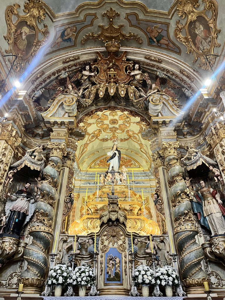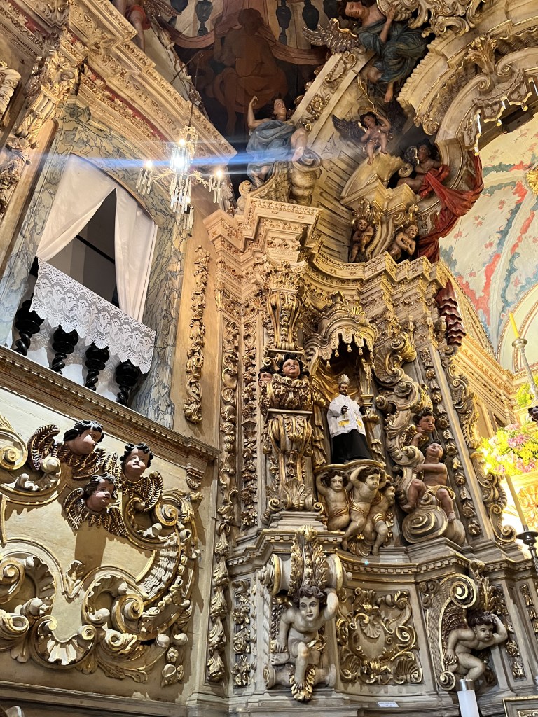 A quarta parada foi para visitar a Igreja de Nossa Senhora do Pilar, considerada uma das obras-primas da arquitetura barroca brasileira, foi construída entre 1711 e 1733, é uma das mais antigas da cidade. A igreja é linda, repleta de detalhes em ouro, com uma decoração interna muuuito rica e exuberante, característica bem típica do estilo barroco.