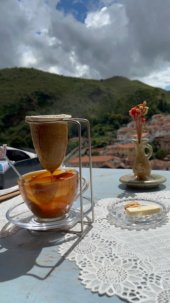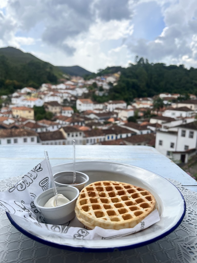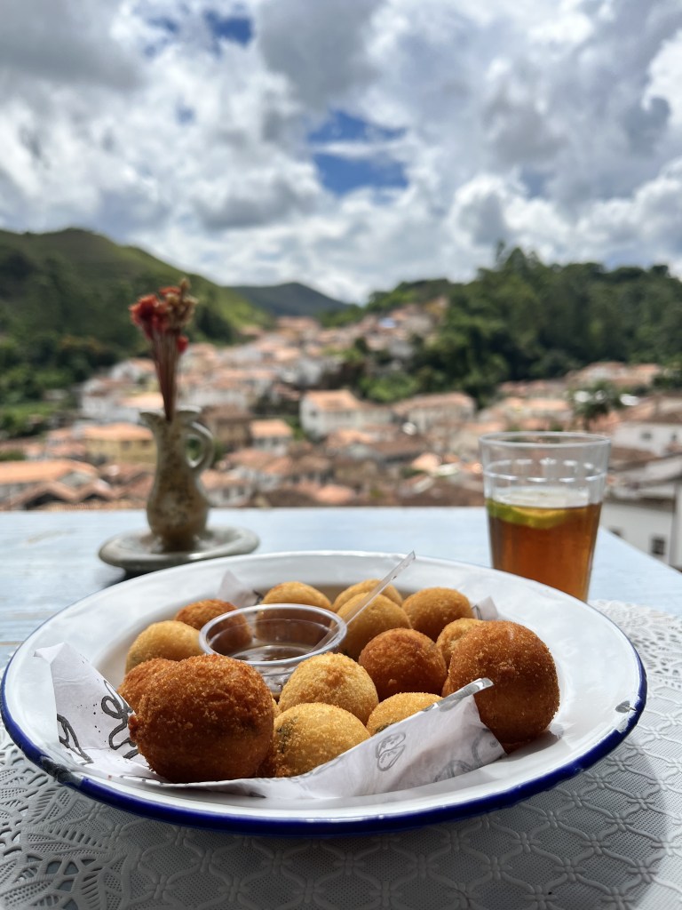 Depois de visitar a última igreja do dia, fomos petiscar numa cafeteria com uma vista incrível da cidade, o Café da Escadinha. Responsáveis pelo melhor pão de queijo que comi em Ouro Preto, por apenas R$3!!! Nós pedimos um chá mate, café coado na hora com doce de leite, pães de queijo e uma porção de bolinho de tilápia com queijo cremoso. Tudo muito gostoso! Gostamos tanto que depois voltamos lá no último dia pra pedir uma porção de waffle com doce de leite e cream cheese, limonada e um chopp. Recomendo demais, é uma das paradas obrigatórias por lá! ❤️
