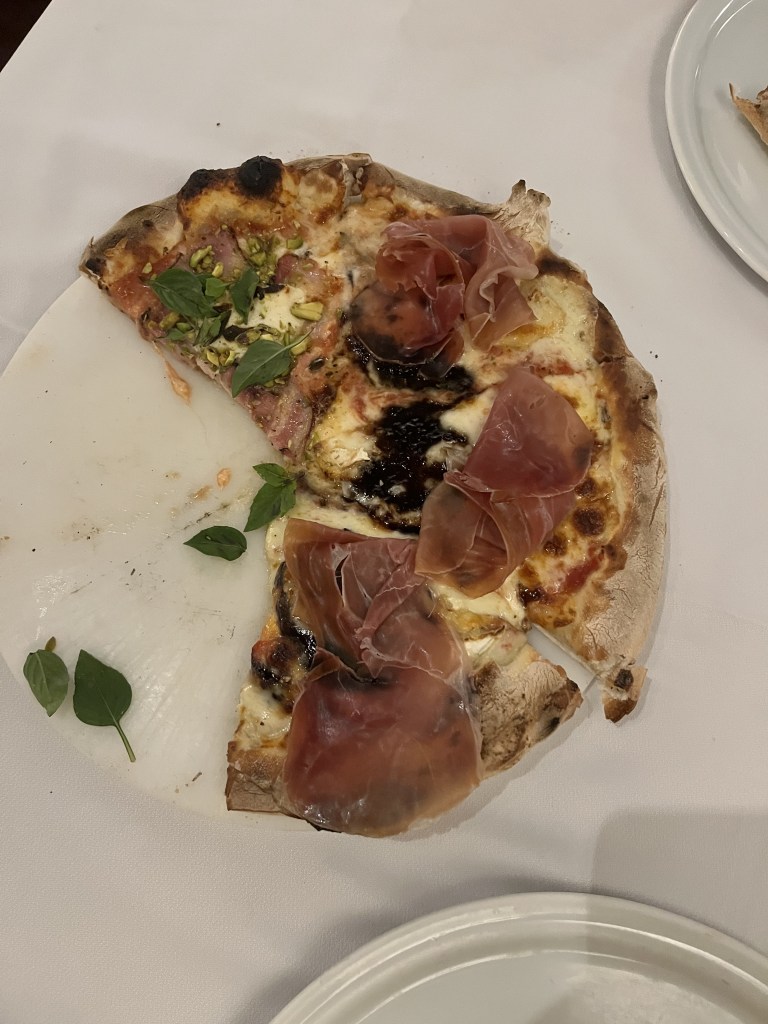 De entradinha, pedimos o “Couvert Passo” (R$32), uma seleção de pastas artesanais acompanhadas de caponata de berinjela e tomates assados. Já as pizzas pedimos metade “Brie e Parma”, feita com molho artesanal de tomate e geleia de jabuticaba, e a outra metade pedimos a opção “Itália”, que vem com mozzarella especial, panceta, creme de ricota e ervas, finalizada com farofa de pistache e manjericão (foi a minha preferida!!!). Pra fechar, de sobremesa pedimos o petit gateau de limão siciliano com sorvete de castanha do Pará (R$33). Achei delicioso, muito cremoso e refrescante!