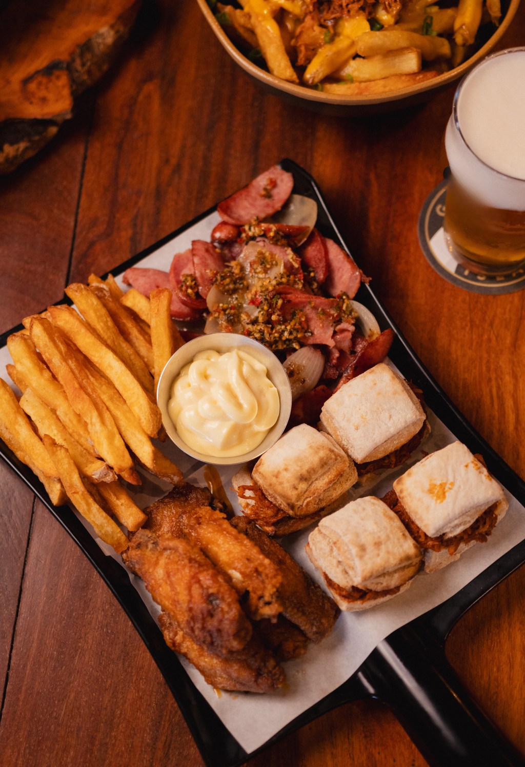 Com uma variedade de 15 taps rotativos servidos em 280ml ou 470ml (a partir de R$ 14 e R$ 23, respectivamente), incluindo Goose Island, Colorado, Patagonia, Hocus Pocus e Bragantina, o Beer Island Tap House também oferece opções para dividir com os amigos, como o Pa Compartilhar (R$ 105) com batatas fritas rústicas, mini rib buns (sanduíches de pernil desfiado), linguiça artesanal grelhada com chimichurri e chicken wings (asinhas de frango picantes mergulhadas no molho à base de pimenta sriracha) ou Pulled Pork Fries (R$ 45), com batatas rústicas cobertas com pernil desfiado, molho barbecue, creme de queijo e sour cream. Além das opções de burguers, como The Big 33 (R$ 44) – feito com 140g de carne, queijo cheddar, rúcula, tomate grelhado, crispy de cebola e maionese defumada no pão de brioche – ou Duck Burger (R$ 46) – com carne de pato de 180g com cebolas caramelizadas na cerveja English Bitter, queijo minas padrão e maionese defumada no pão de brioche.