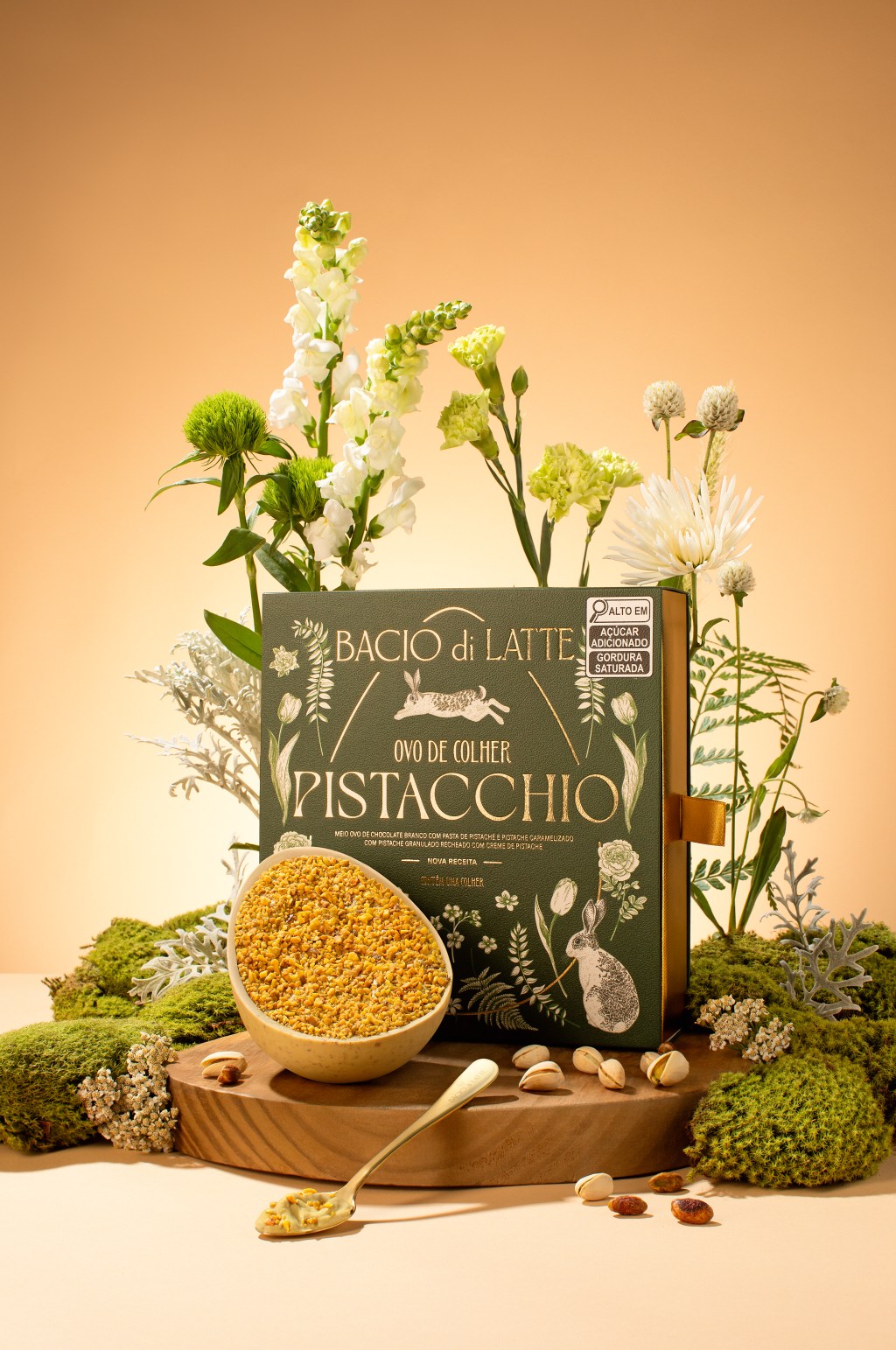 A novidade que promete conquistar os paladares mais exigentes chega com foco total na indulgência: um ovo de Páscoa de colher (380g), feito com casca de chocolate branco e pedaços de pistache, recheado com creme de Pistacchio e finalizado pistache crocante. A embalagem especial, apresentada em uma caixa quadrada com hot stamp, vem acompanhada de uma colher exclusiva para a degustação. Preço: R$179,90.