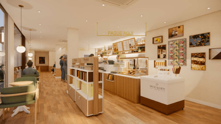 Na nova loja, os clientes poderão encontrar mesas e cadeiras para consumir 22 sabores dos deliciosos gelatos da Bacio di Latte, um Mercato com produtos selecionados da marca para consumir em casa, as linhas completas de Caffetteria e Confetteria.