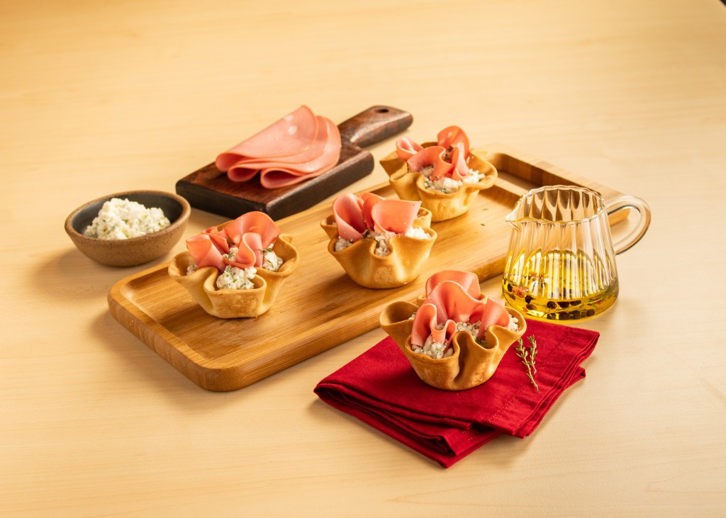 - Recheie as cestinhas com o creme de ricota e em cada cestinha coloque uma fatia de Mortadela Ouro Fatiada Perdigão, dobrada em formato de flor.