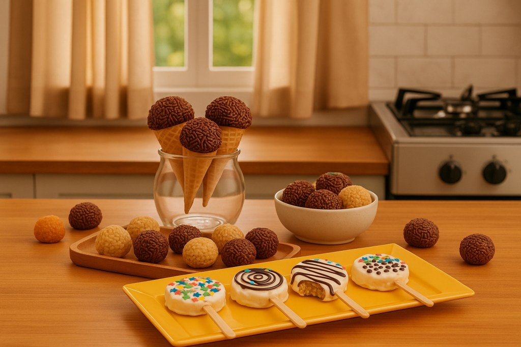 A primeira opção é um brigadeiro de amendoim, feito com um dos ingredientes mais consumidos em doces tipicamente brasileiros. Já a segunda é o cone trufado de brigadeiro, sugestão de receita criativa, que pode ser colorida e perfeita para animar qualquer festa ou encontro em família. A terceira são pirulitos de bolo gelado, ideais para quando as crianças se reúnem.