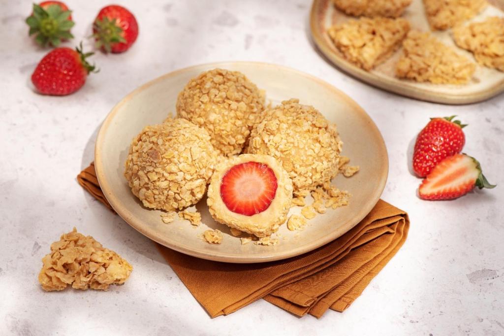 O preparo destaca Croc Choco, o chocolate com flocos de milho da NISSIN que conta com as versões ao leite e branco, utilizado para envolver o bombom de morango. O resultado é uma fusão de sabores e contrastes, desenvolvida para ser o grande destaque da mesa de sobremesas nesta temporada.